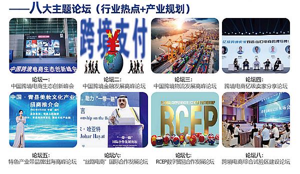 此次展会将以“拥抱数字经济,赋能产业集群;掘金跨境电商·助力品牌出海”为主题,旨在为跨境电商平台、服务商 及外贸企业、采购商提供品牌展示、贸易洽谈、采购对接、资源共享为一体的高端交流合作平台。此次展会共设置“八大 特色展区”,开设“八大主题论坛”,开展“八大特色活动”,为展商提供“八大尊享福利”,为推动我国跨境电商高质量发展,群策全力、贡献力量。