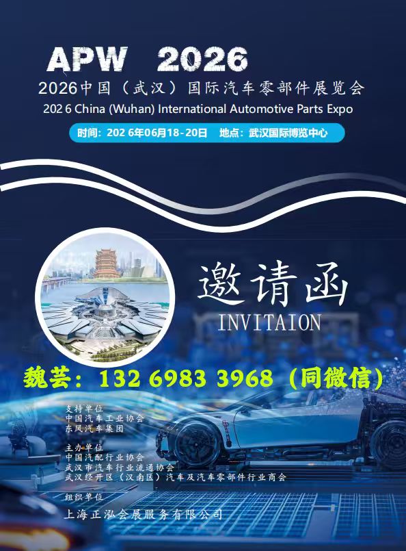 2026中国(武汉)国际汽车零部件博览会时间:2026年6月18-20日地点:武汉国际博览中心邀请函支持单位:中国汽车工业协会、东风汽车集团主办单位中国汽配行业协会、武汉市汽车行业流通协会、武汉经开区(汉南区)汽车及汽车零部件行业商会组织单位上海正泓会展服务有限公司展会背景