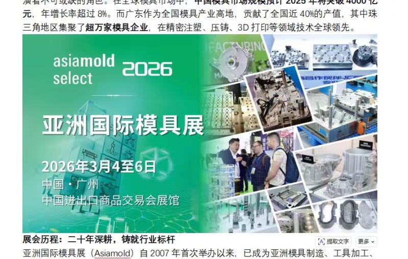 2026年3月4日至6日,让我们相约广州进出口商品交易会展馆,共同见证亚洲模具展二十周年的辉煌时刻,携手开拓模具产业的新蓝海。
