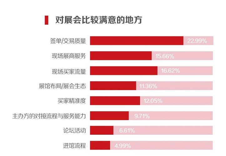 展商的满意程度是我们前行的动力!数据显示,93.96%的参展企业表示满意。其中,签单/交易质量(22.99%)、现场展商服务(15.66%),现场买家流量(16.62%)、展馆布局/展会生态(11.36%),买家精准度(12.05%),再到论坛活动(6.61%)、现场工作服务及进馆流程(14.7%)等都是展商满意的重要因素。