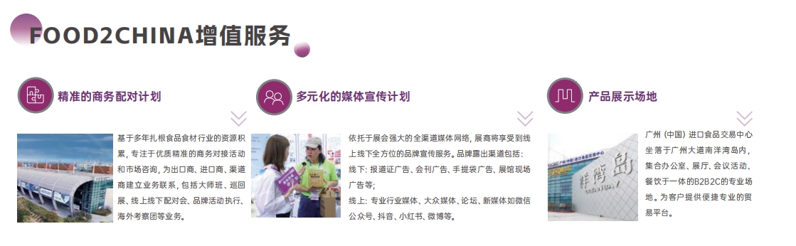 2024年,中食展®携手Food2China Expo、广州国际食品食材展览会、Wine to China Expo(源于TOEwine)、广州(江南)国际果蔬产业博览会、广州国际渔业博览会,六展合一、全面升级,充分发挥政府、行业商协会及企业凝聚力,共同打造以广州为中心、链接全球、辐射全国的国际食品展览会。