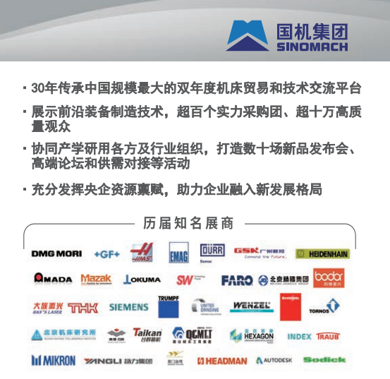 2024年第十六届中国国际机床工具展览会时间:2024年6月17-21地址:北京新国际展览中心(顺义区)自1992年以来,中国国际机床工具展览会(CIMES)每逢双年在北京举行,30年来,企业通过CIMES拓展业务渠道,交流先进技术,实现经济增长,CIMES以成为世界推动机床行业技术和贸易发展的重要平台,也是世界了解中国这个最大机床工具消费市场的最佳窗口。主办单位:中国机床总公司、中国机械工业集团有限公司、中国机械国际合作股份有限公司承办单位:北京国机展览有限公司规 模:展出面积 12万平米,展商1300家,观众10万+时 间:2024年6月17-21地 址:北京新国际展览中心(顺义区)展馆分布E1馆:加工中心、磨床、铣床、车床、测量、工业互联网、工业自动化E2馆:加工中心、磨床、铣床、车床、测量、工业互联网、工业自动化E3馆:金属成型设备、激光加工设备E4馆:金属成型设备、激光加工设备W1馆:德国、美国、瑞士、意大利、英国等国际加工中心、磨床、铣床、车床、测量、工业自动化W2馆:日本、中国台湾等亚洲国际加工中心、磨床、铣床、车床、测量、工业自动化W3馆:刀具、测量、机床附件等W4馆:机床附件、工业自动化、增材制造等联系方式展会负责人:张雪 15010227219微信: 13303976215电话:010-61057739在线 QQ: 1452655457邮箱:1452655457@qq.com