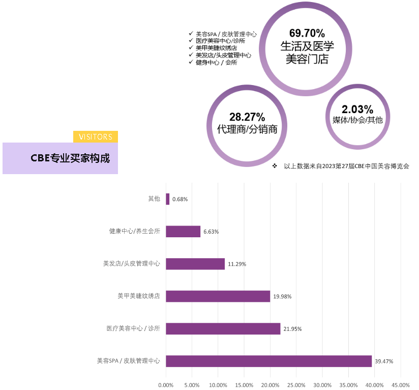 往届展会中,近70%的观众来自美容SPA / 皮肤管理中心、美甲美睫纹绣店、美发店/头皮管理中心、医疗美容中心 / 诊所、养生会所等美业终端渠道。