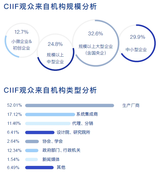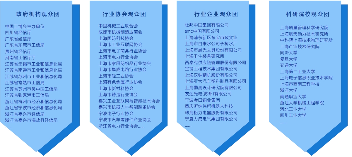 中国工博会展期预计接待超过250个专业观众团体,共计超过205,278人次的专业观众和买家,主要来自政府机构主办部门、行业协会及以下不同行业:电子信息,工程机械,汽车制造、石化/冶金、能源装备、建筑工程、食品饮料、生物医药、包装印刷、纺织/服装以及各科研院所和相关院校。