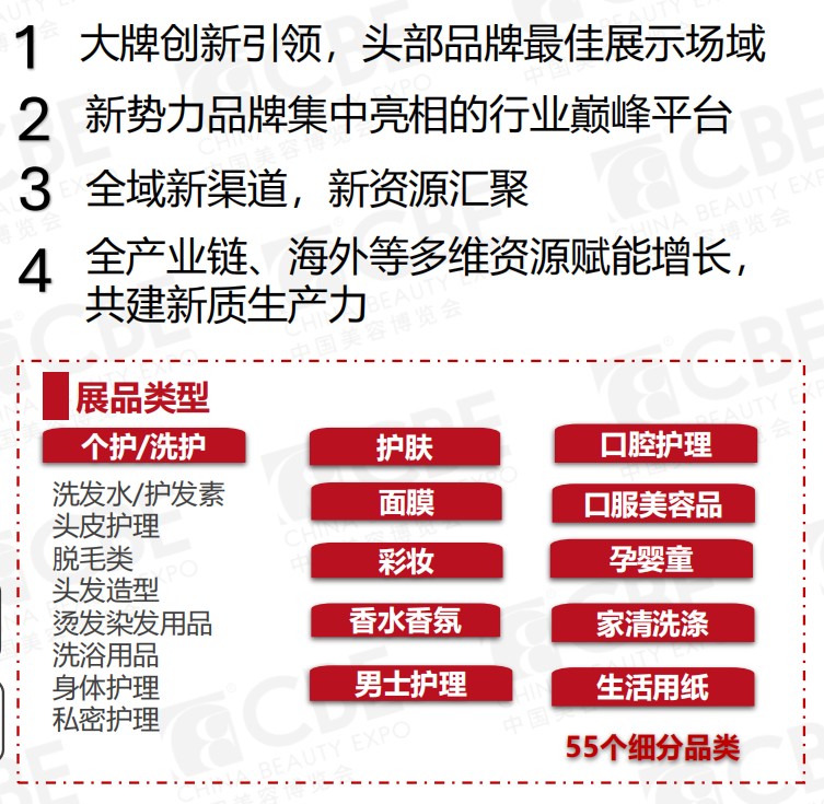 本届CBE化妆品展将以其恢弘的气势震撼登场,展品如繁星般散落于10大展馆及数十个主题馆之间,恰似一幅绚丽多彩的画卷徐徐展开。其涵盖了14大类40多个细分品类,从护肤的水润滋养到彩妆的明艳动人,从发品的飘逸灵动到护理用品的悉心呵护,无所不包,尽显美妆世界的丰富多元。这场盛会预计将吸引线上线下全域近五十万人次的买家纷至沓来,共赴这场汇聚时尚与科技前沿、领衔美妆趋势的年度狂欢,无疑是一场不容错过的行业饕餮盛宴。