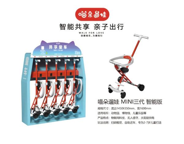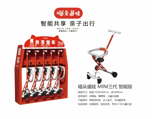 喵朵遛娃是全球智慧出行的新生代共享童车品牌,倡导为亲子家庭带来轻松的出行体验。喵朵遛娃专注为 2--7 岁的宝宝在大型景区、动物园、主题乐园、商场游玩时,提供物联网分时租赁儿童推车,旨在提升亲子生活品质,同时响应国家完善公共服务设施号召。