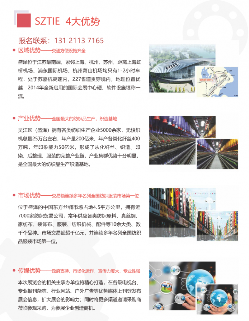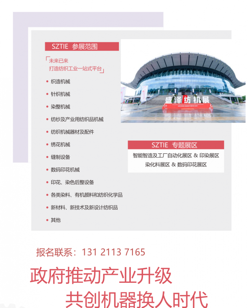 SZTIE2026中国(盛泽)国际纺织机械及印花工业展览会作为江苏 地区领先的纺机与印花行业盛会 , 紧跟国际发展趋势与市场需求 , 专注 传统纺织制造技术升级和未来纺织开发技术 , 推动企业在该领域的创新 及高速发展 , 是提升国际影响力 、 市场竞争力 、文化传承力的最佳展示 平台 。预计将汇聚来自世界各地500余家展商参展 , 吸引20000位专业 观众到场参观。