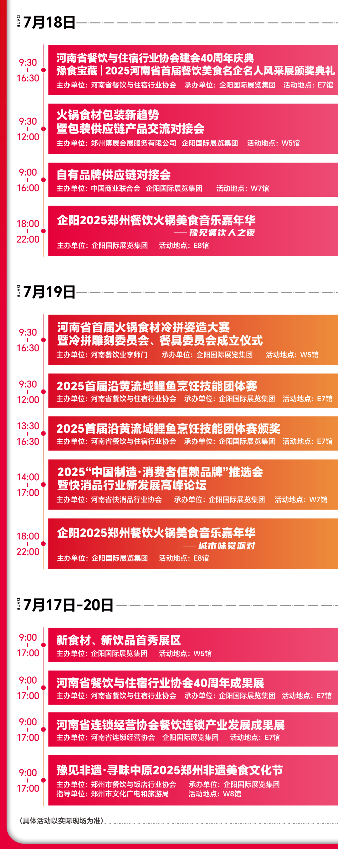 洞察趋势,把握先机。展会同期举办展览会开幕式、全国餐饮流量大会、自有品牌供应链大会、2025自有品牌全球市场拓展论坛暨助力企业出海战略与资源、2025第二届预制食材创新发展高峰论坛、2025第三届河南餐住协火锅烧烤专委大会暨中原烧烤高质量发展论坛、企阳2025郑州餐饮火锅美食音乐嘉年华等多场活动,围绕市场变化和需求等热门话题,深入剖析了行业发展趋势,为餐饮行业带来了新的活力和机遇。