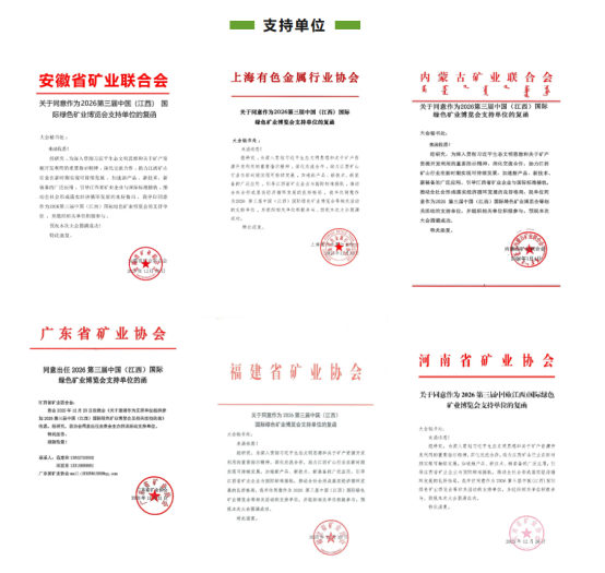 我们坚信,在各行业协会的鼎力支持、全产业链企业的积极参与、社会各界的广泛关注下,2026第三届中国(江西)国际绿色矿业博览会必将成为一场规格高、影响广、实效强的国际矿业盛会,为推动全国绿色矿业转型升级、助力江西打造世界级矿业基地贡献重要力量!