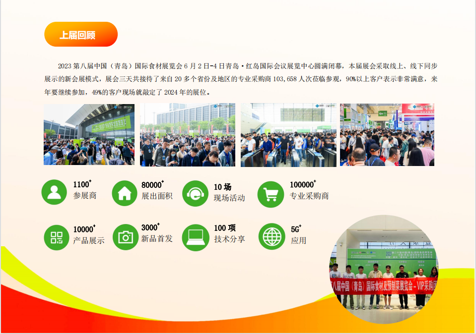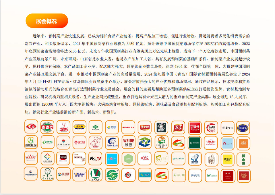 火锅底料、蘸料、汤料、调味料;火锅冷冻调理食品、火锅配料、火锅涮品及特色新食材等;冷冻/冰鲜肉、肉卷、肉丸、火腿、香肠、调理食品及即食产品等;海鲜冻品、干品、活品、水产调理食品及深加工制品等;冷冻/速冻家禽、分割禽、禽肉调理食品、禽肉深加工食品、蛋品等;冷冻/速冻蔬菜、调理菜、酱菜、泡菜、蔬菜制品及各种食用菌菜等;汤圆、水饺、春卷、麻球、饼类、糕点、冰淇淋等;食用油、酱油、醋、腐乳鸡精、鸡粉、鸡汁、味精、料酒、香辛料、酱腌菜、酱、复合调味料 (汁)、鱼露、食糖、食盐等;豆制品、米面制品、杂粮制品、配餐、快餐、中餐及酒店半成品食材,农特食材等;预制菜、调理食品、半成品食材、料理包;加工机械、冷冻冷藏设备、食品冷链物流运输、中央厨房、餐饮配送、各类餐厨用具等