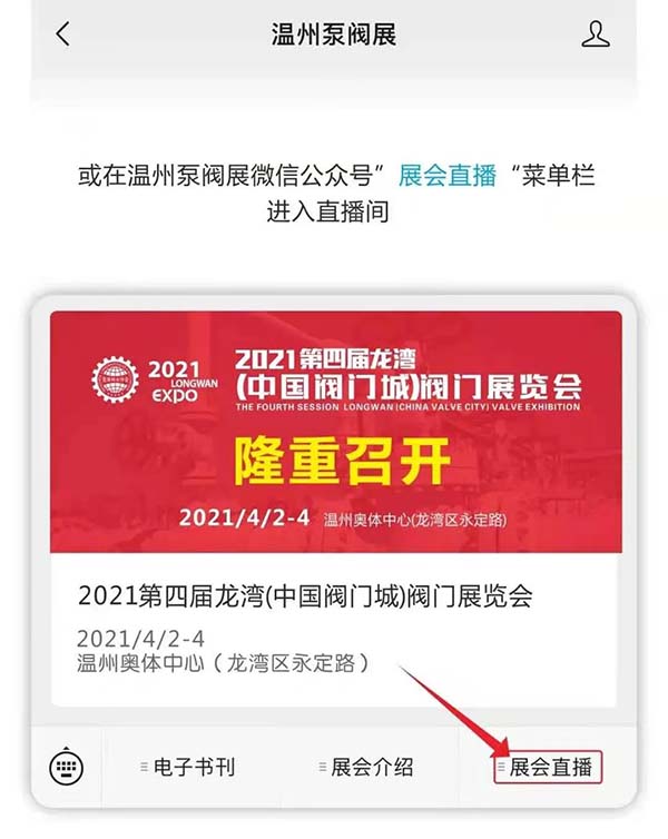 或关注温州泵阀展微信公众号,“展会直播”菜单栏点击进入直播间。