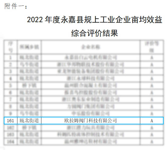 不以规模定标准,而以“亩均论英雄”。近日,根据《深化“亩均论英雄”改革2023年工作要点》文件精神,永嘉县深化“亩均论英雄”改革工作领导小组办公室发函相关部门,对相关数据进行了收集与校对。并按照综合评价办法,对全县相关工业企业进行分类评价。经评定,欧拉姆被评定为2022年度永嘉县规上工业企业亩均效益A类企业。