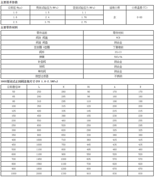 300X缓闭止回阀由主阀、单向阀、针阀、球阀、微形过滤器和压力表组成水力控制接管系统。利用水力自动操作,可使主阀得到一定的开启或关闭速度。防止水锺水击的产生,以达到缓闭消声的效果。