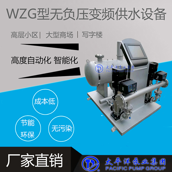 WZG无负压变频调速供水设备依据供水管网中瞬时变化的压力和流量参数,自动改变水泵的台数和运行转速,实现恒压变量供水的闭环调节,从而达到提高公司质量和高效节能的目的