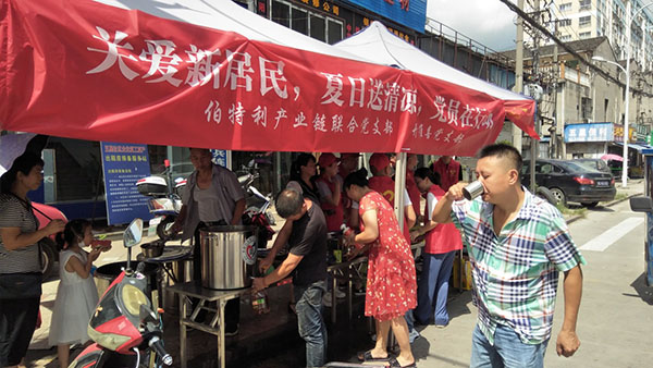 “来来,大爷,过来吃块西瓜喝杯凉茶,解解渴,消消暑!”骄阳似火,酷暑难当。8月2日上午,伯特利产业链联合党支部、开维喜党支部、县新居民服务中心杨丽和省匠工作室、县义工联等单位联合自发地开展“关爱新居民、高温送清凉”党员志愿者服务日活动,为战高温、斗酷暑的广大温州新居民送去丝丝的清凉和两新党组织的关怀。